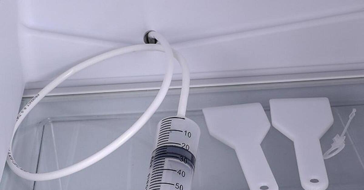 Вставьте носик спринцовки в отверстие и с силой впрысните воду. Повторите 3-4 раза. Вы должны услышать характерное «бульканье» или звук льющейся воды сзади холодильника — это значит, вода ушла в ванночку.