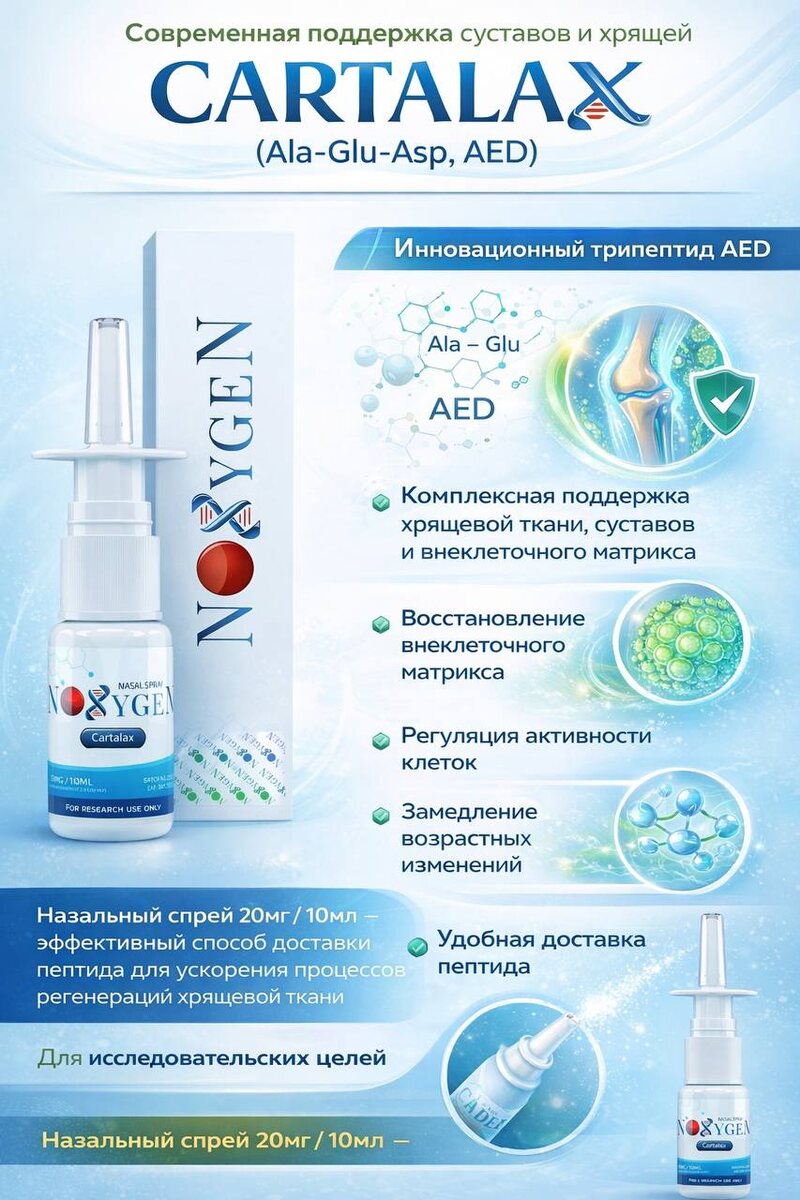 Современные исследования всё чаще подтверждают: здоровье суставов — это не только про комфорт движения, но и про качество жизни в долгосрочной перспективе. Cartalax (Ala-Glu-Asp, AED) — инновационный трипептид, разработанный для изучения и поддержки процессов, связанных с хрящевой тканью и внеклеточным матриксом. 💡 Что делает Cartalax особенным? — Структурно гомологичен участкам коллагена XI типа — Взаимодействует с клеточными механизмами соединительной ткани — Поддерживает баланс внеклеточного матрикса — Способствует регуляции активности клеток хрящевой ткани 🧬 Фокус действия: ✔ Поддержка хрящевой ткани и суставов ✔ Влияние на процессы регенерации ✔ Поддержание эластичности и прочности соединительной ткани ✔ Замедление возрастных изменений на клеточном уровне 💧 Форма: Назальный спрей 20mg / 10ml — удобный и современный способ доставки пептида в рамках исследовательских протоколов. 🛒🛒🛒🛒🛒🛒🛒🛒🛒🛒 ✅ НАШ САЙТ 🧿 OZON 📲📲📲📲📲📲📲📲📲📲 😄 ВКонтакте 😉 Youtube 😌 Telegr