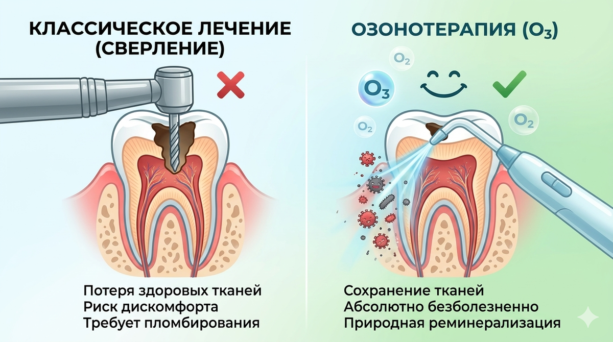Многие до сих пор ассоциируют поход к стоматологу с шумом бормашины и дискомфортом. Но что, если озон может стать вашим главным союзником в борьбе за здоровую улыбку? Озонотерапия — это нишевое, но невероятно эффективное направление в современной клинике. Озон (O3) — мощнейший природный окислитель. При контакте с тканями он за считанные секунды уничтожает 99% бактерий, вирусов и грибков, не повреждая при этом здоровые клетки. Лечение кариеса на ранней стадии: Если кариес только начался (стадия «белого пятна»), озон стерилизует фиссуры, позволяя обойтись без сверления и пломб. Стерилизация каналов: При лечении пульпита газ проникает в мельчайшие ответвления каналов, куда не достанет ни один инструмент. Это сводит риск осложнений к нулю. Лечение десен: Озон мгновенно снимает воспаление при пародонтите и ускоряет заживление тканей. Стоматиты и герпес: Буквально одна процедура способна «подсушить» язвочку и избавить от боли. Удаление зубов: Обработка лунки озоном гарантирует быстрое заживл