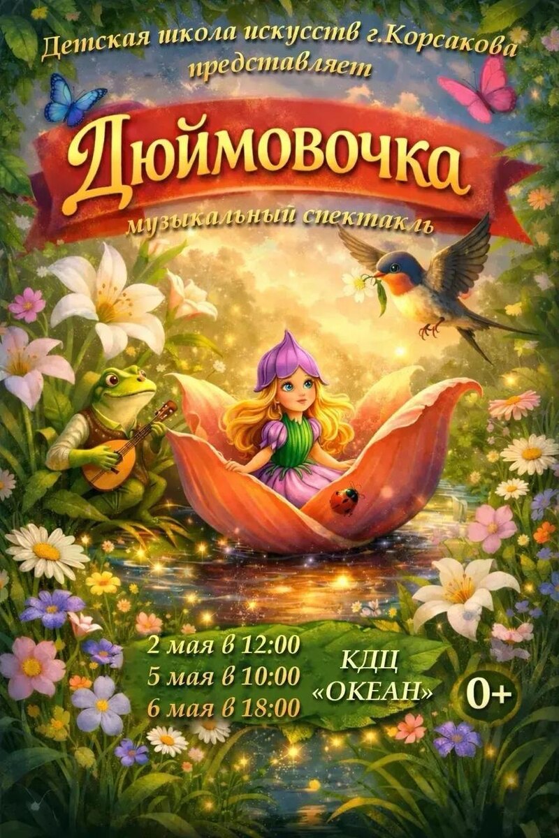 » 🌸02 мая в 12-00 в КДЦ «Океан» случится настоящее чудо - премьера музыкальной сказки по мотивам произведения Ганса Христиана Андерсена «Дюймовочка», история о силе духа и о том, что даже в самые темные времена нужно верить в свет. 🩷Зрители смогут увидеть творческий эксперимент, в котором вместе с юными артистами, хореографами и вокалистами на сцену выйдут их педагоги-наставники. ❗️Красочные костюмы, яркие заставки, выполненные художниками, и музыка создадут атмосферу волшебства, которая так необходима и маленьким зрителям, и взрослым. 📍Спектакль «Дюймовочка» Детской школы искусств — это подарок для всей семьи. Здесь будет место и смеху, и легкой грусти, и, конечно, хеппи-энду, который оставляет после себя ощущение светлой радости. 💫Приходите всей семьей поддержать юные дарования нашего города и любимых педагогов! Сказка ждет своего зрителя! 🧷Показы состоятся 2, 5 и 6 мая в КДЦ «Океан». Телефон для справок 4-43-90 🧒Подписывайтесь на Мой Корсаков в MAX и будьте в ку