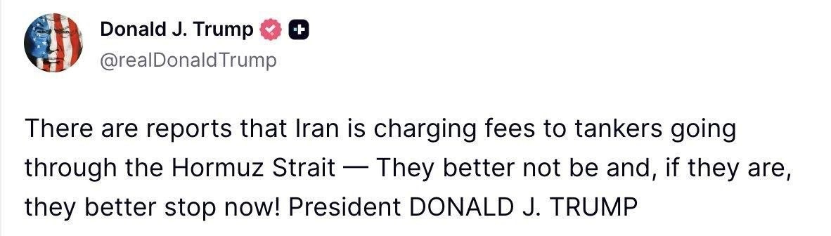 ❗️ Трамп снова жёстко предупреждает Иран: «Есть сообщения, что Иран взимает плату с танкеров, проходящих через Ормузский пролив