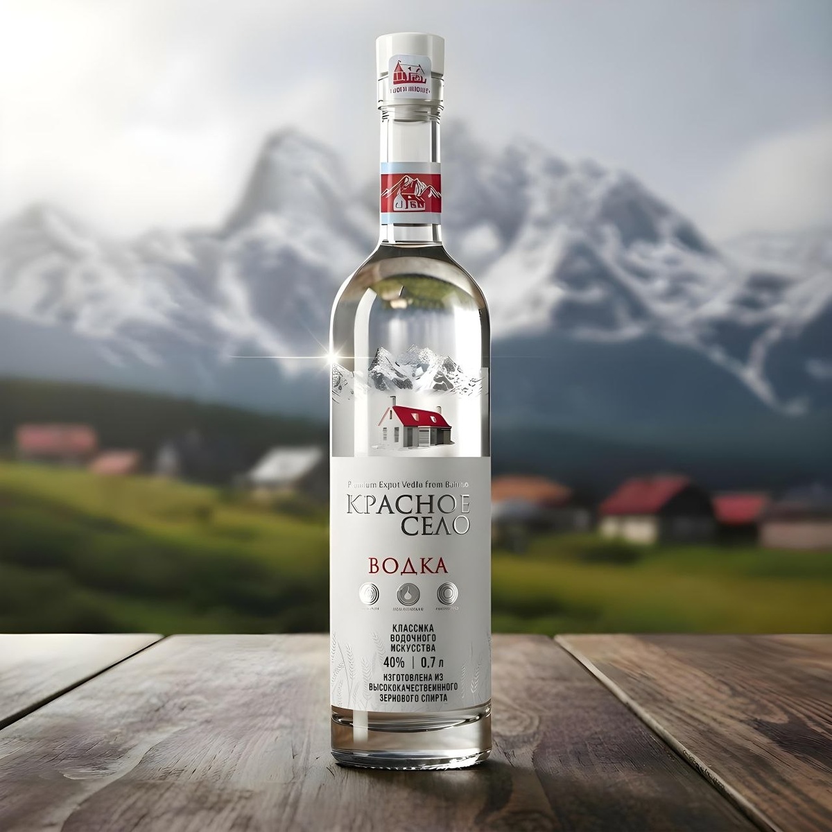 Дизайн - Россия, производство - Беларусь, продажа - Азербайджан. Особенность дизайна - двусторонняя контрэтикетка. С одной стороны горная деревня, с другой стороны - текст, плюс фигурная вырубка. Голографические элементы на горлышке.