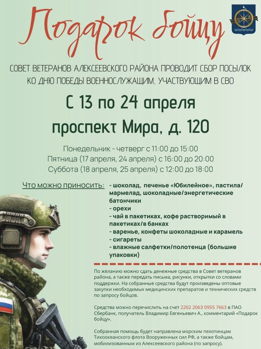 🇷🇺 📑Совет Ветеранов Алексеевского района проводит сбор посылок ко дню Победы военнослужащим, участвующим в СВО. ‼️Сбор будет проходить с 13 по 24 апреля, проспект Мира, д.120. 🔊Координатор от Совета Ветеранов – Якушева Елена Ивановна, 8-495-682-20-40.