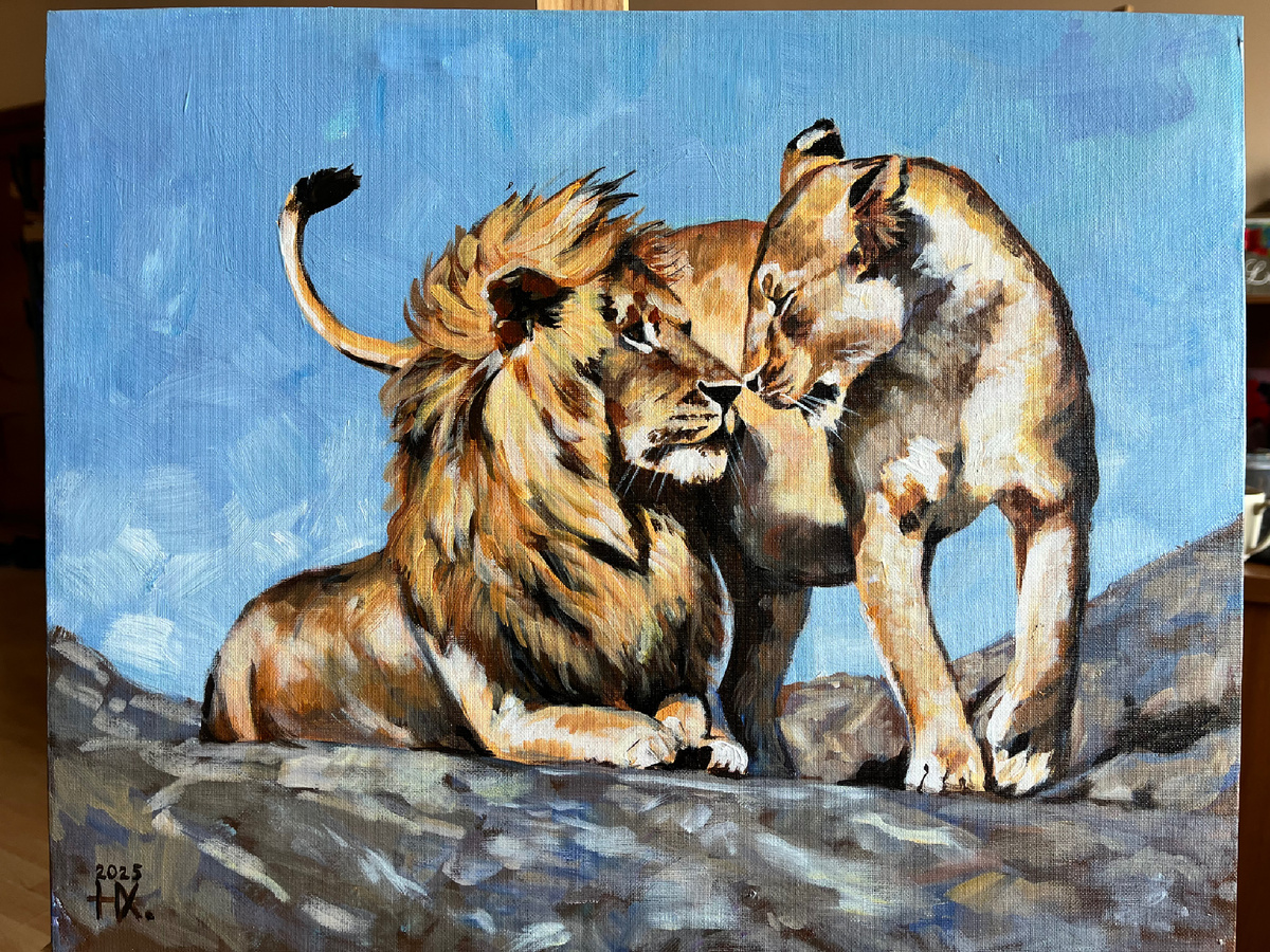 Картина Львы на холме. "Соединение сердец" Львы на возвышении 50/40 см. На картине изображены два льва на фоне ярко-голубого неба. Один из львов лежит на земле, расслабленный и умиротворенный, а другой стоит рядом, нежно склонившись над первым. Они касаются друг друга носами, выражая нежность и взаимопонимание.