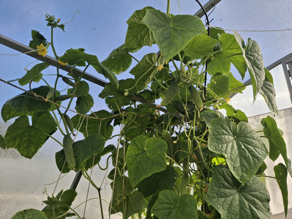 Очевидные плюсы: теплица проветривается, хорошо освещается, каждый огурчик на виду. Растения быстро вступают в плодоношение и плодоносят равномерно. Нет такого, что вдруг нужно переработать четыре корзины зеленцов за раз. Желательно, чтобы теплица и шпалера были высокими, чтобы не опускать огурцы очень рано и часто.