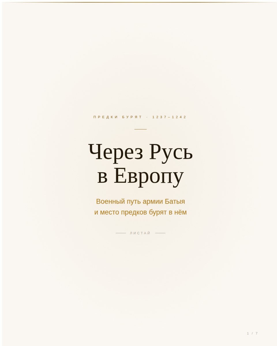 Декабрь 1237 года. Армия Батыя переходит Волгу. В её составе — воины из десятков племён, среди которых предки бурят из Прибайкалья. Рязань пала за шесть дней. В марте 1238-го на реке Сити разгромлено войско северных русских князей. В декабре 1240-го взят Киев. Весной 1241-го монголы разбили польско-немецкое войско при Легнице и вышли к берегам Адриатического моря. От Байкала до Хорватии — около 10 000 километров за шесть лет. В 1242 году пришла весть о смерти великого хана Угэдэя. Армия повернула назад. Предки бурят прошли этот путь в обе стороны.