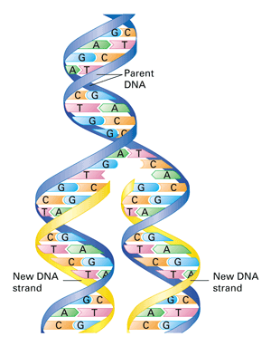 С помощью специальных ферментов двойная спираль материнской ДНК расплетается на две нити, на каждой образовавшейся нити достраивается вторая нить, образуя две идентичных дочерних молекулы ДНК, которые затем скручиваются в отдельные спирали.