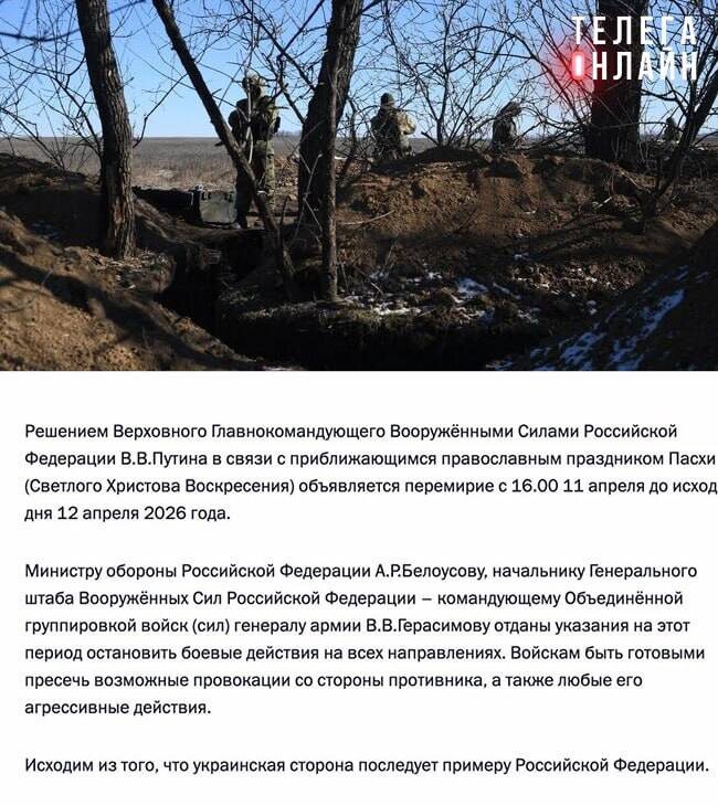 Владимир Путин объявил пасхальное перемирие с 16:00 11 апреля до исхода дня 12 апреля 2026 года. Москва рассчитывает, что украинская сторона последует российскому примеру, хотя мы, наученные опытом множества перемирий в период минских соглашений, сильно сомневаемся. 🚲 Подпишись на Телега Online