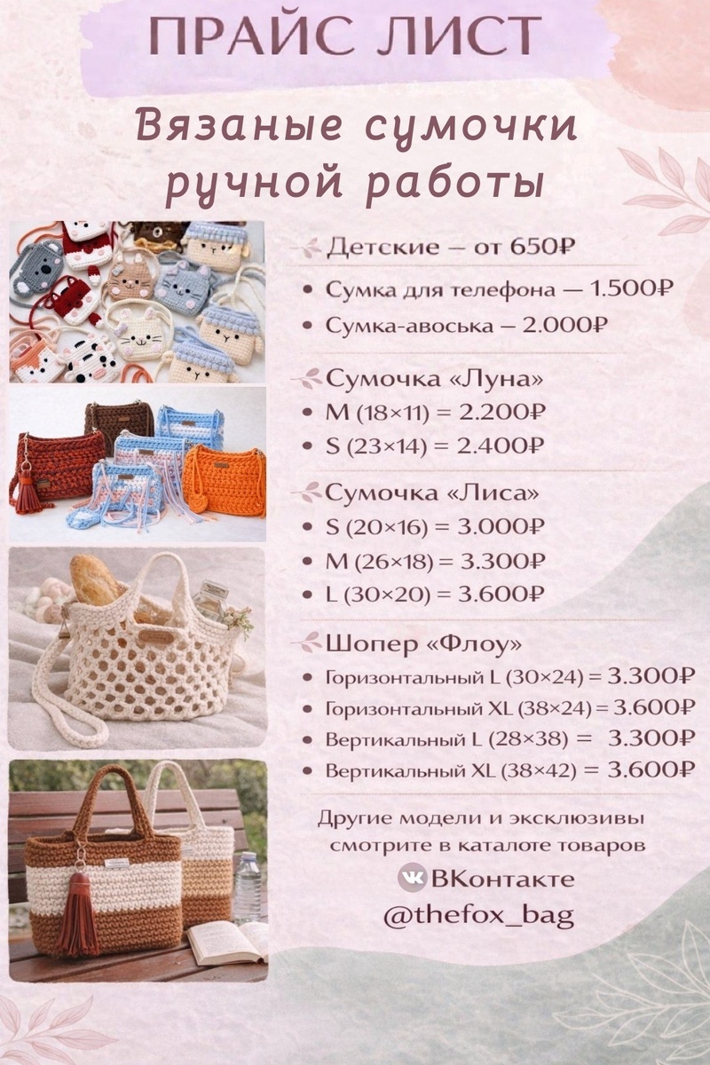🤍🤍🤍🤍🤍 🤍🤍 🤍🤍🤍🤍🤍 🤍 🔤етские сумочки 🎒 — очаровательные и весёлые аксессуары для маленьких модниц, выполненные в виде забавных животных и мультяшных героев. Они прекрасно подойдут для хранения мелочей и станут чудесным подарком. 🔤умка для телефона (цельная или сетка) 📱 — компактный и удобный аксессуар, специально созданный для безопасного хранения вашего телефона. Стильный элемент, который всегда будет под рукой. 🔤воська 👜 — экологичный и практичный аксессуар, который станет отличным спутником в походах за покупками или на прогулках. Лёгкая, вместительная и невероятно стильная! 🔤одель «Луна» 🌙 — элегантная модель с изящными линиями, напоминающими полумесяц. Прекрасно дополнит вечерний образ или станет стильным акцентом в повседневном гардеробе. 🔤одель «Лиса» 👜 — универсальный аксессуар, который станет вашим верным спутником. Вы сможете выбрать идеальный размер для любых нужд — мы предлагаем несколько вариантов. 🔤опер «Флоу» 🛍— просторный и функциональный шопе