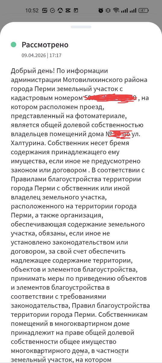 Друзья, ниже прикрепил скрины ответа на обращение, с данным ответом не согласен так как не уверен принадлежит ли данная дорога управляющей компании , это необходимо будет проверить. Когда выясню все детали, дополнительно отпишусь, пока читайте ответ администрации и пишите комментарии что думаете по этому вопросу.