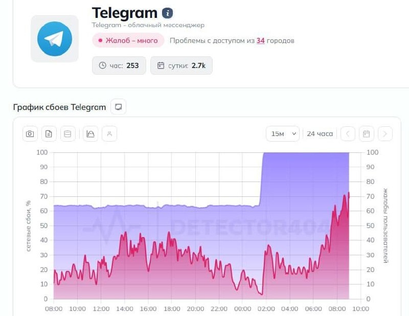 Сетевые сбои этой ночью взлетели с 64% до 100%. Теперь с любого региона не получится подключиться к мессенджеру без дополнительных сервисов. Вот и всё. ⚡️ Подписаться.
