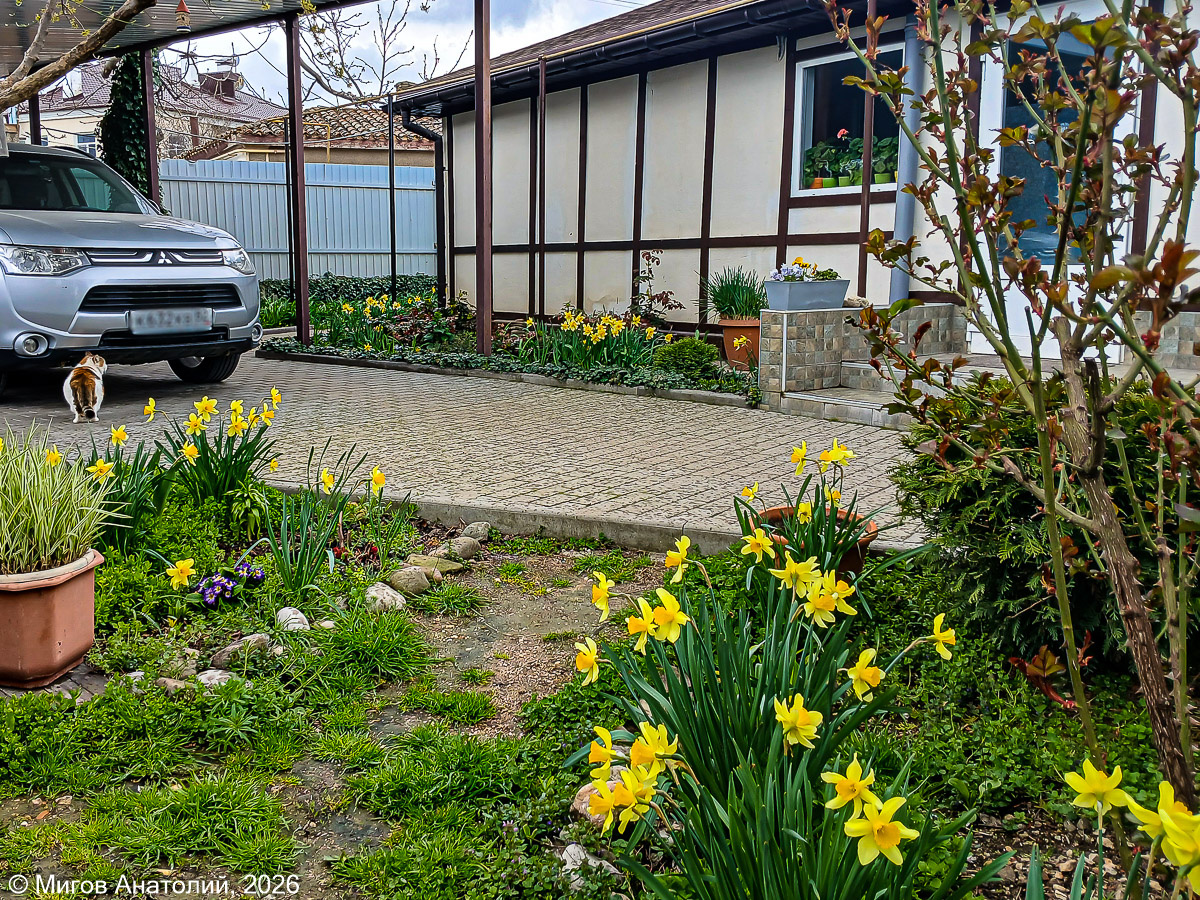 Понемногу солнца нам в Старый Крым каждый день дают. Но не очень щедро. А потом дождь. В общем-то хорошее дело. Не надо поливать, всё само растёт и колосится. Позавчера, в чистый четверг, я даже траву косил на участке. Второй уже покос за апрель. Никогда прежде такого не было. Это всё потому, что много воды. Начал косить, когда солнце выглянуло, а заканчивал уже под дождём. Но справился. И даже успел скосить всю траву за забором. В последние годы у нас на улицах траву косят рабочие из коммунальной службы. Но тут они что-то припозднились, или трава выросла с опережением планов. Так что я ждать не стал, сам справился. Тем более, у нас там растут юкки, я всегда опасаюсь, что ребята их могут скосить заодно с сорняками. Правда надо признать, что пока такого не случалось. Пейзаж в нашем дворе сейчас в жёлтой гамме. Очень много цветущих нарциссов. И немного лунарии. Ещё десять лет назад нам привезли веточку этого растения. Лена его посадила и с тех пор время от времени ей приходится прорежи