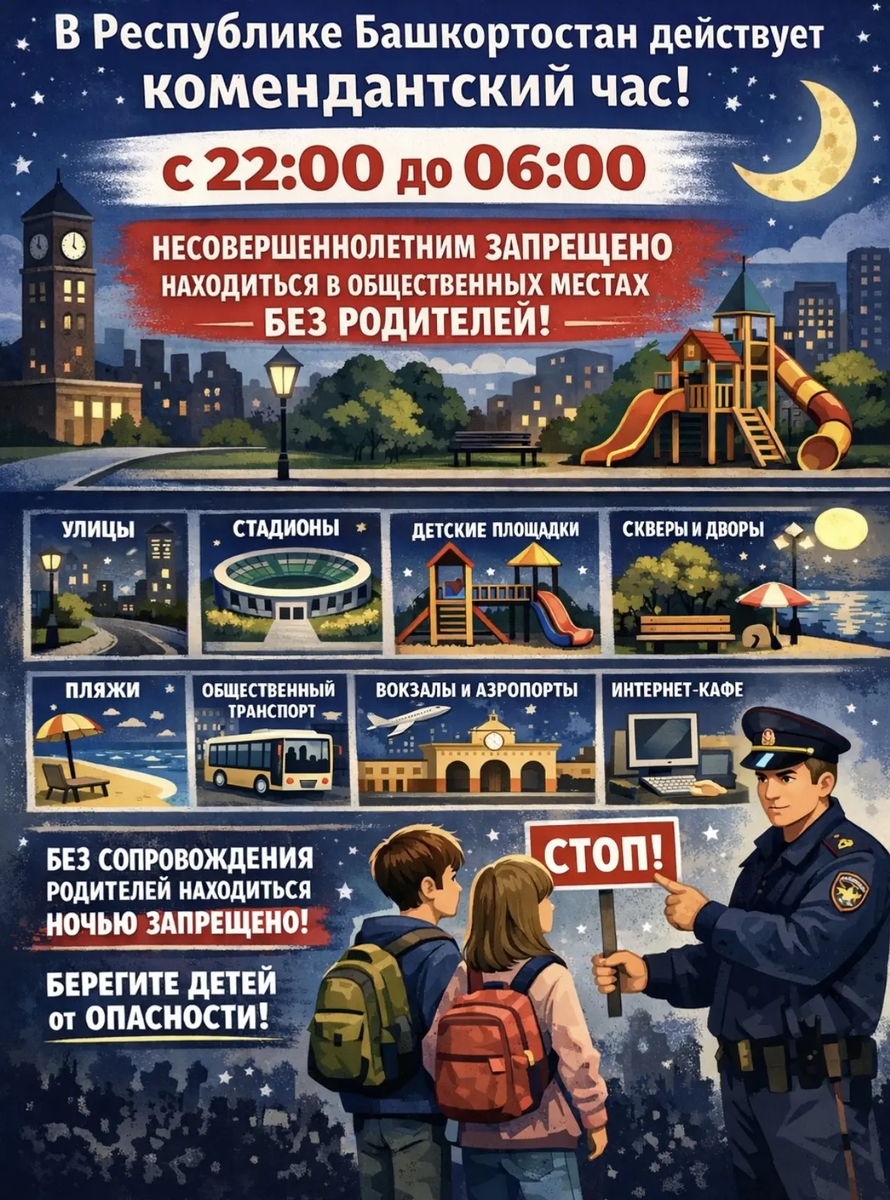По информации Отдела МВД по городу Кумертау, за первую неделю апреля в дежурную часть было доставлено девять человек за различные административные нарушения, в том числе трое несовершеннолетних – за нарушение комендантского часа. Сотрудники Отдела МВД напоминают жителям Кумертау о том, что с 10 часов вечера действует комендантский час, во время которого нахождение детей в общественных местах без сопровождения взрослых недопустимо. За данное правонарушение родителям задержанных детей придётся выплатить штраф. Уважаемые кумертаусцы, еще раз напоминаем вам о о том, что комендантский час для несовершеннолетних объявлен по Башкирии с 1 октября по 30 апреля, он действует с 22:00 до 06:00. В это время несовершеннолетним гражданам, не достигшим 17 лет, запрещено находиться в общественных местах без сопровождения взрослых. К общественным местам относятся: - улицы и площади; - парки, скверы и дворы; - детские и спортивные площадки; - пляжи; - общественный транспорт; - вокзалы, порты и аэропорты;
