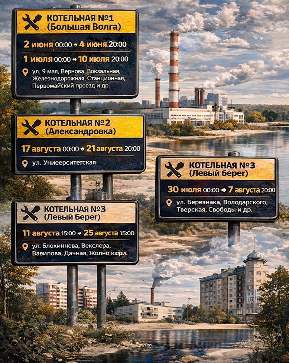 В этом году сроки изменились: на Левом берегу их сократили, а в Институтской части, на Чёрной речке и Большой Волге — увеличили. В Александровке всё осталось без изменений. Вот подробности: 🛠 Котельная №1 (Большая Волга) с 00:00 2 июня до 20:00 4 июня с 00:00 1 июля до 20:00 10 июля 📍 ул. 9 мая, Вернова, Вокзальная, Железнодорожная, Попова, Правды, Станционная, Школьная, Энтузиастов, Первомайский проезд, часть проспекта Боголюбова — от моста до вокзала БВ 🛠 Котельная №2 (Александровка) с 00:00 17 августа до 20:00 21 августа 📍 ул. Университетская 🛠 Котельная №3 (Левый берег) с 00:00 30 июля до 20:00 7 августа 📍 ул. Березняка, Володарского, Карла Маркса, Кирова, Макаренко, Орджоникидзе, Программистов, Свободы, Тверская, Урицкого, Центральная, 1-й и 2-й Театральные проезды, Хлебозаводской переулок 🛠 Котельные №4 «Центральная» и №5 «Восточная» (Институтская часть и Чёрная речка) с 15:00 11 августа до 15:00 25 августа 📍 ул. Блохинцева, Векслера, Вавилова, Дачная, Жолио-Кюри, За