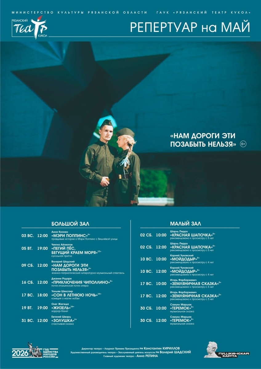 афишу на май! ✨Чем порадуют зрителей артисты? Притчей, балетом и песнями Победы. «Обратите внимание: афиша будет расти. В мае вас ждут несколько сюрпризов, но пока сохраним их в тайне», — предупредил рязанцев театр. Один момент отметим особенно: возвращение проекта рязанского отделения Союза театральных деятелей России «Победа в каждом из нас». Автор проекта — министр культуры области Екатерина Шуранова. Премьера состоялась прошлым летом, в День памяти и скорби, 22 июня, и прошла с большим успехом. ➡️Билеты на майские спектакли, как всегда, в кассе и на сайте — выбирайте. #гуляка_театр ⏩️Рязанский гуляка
