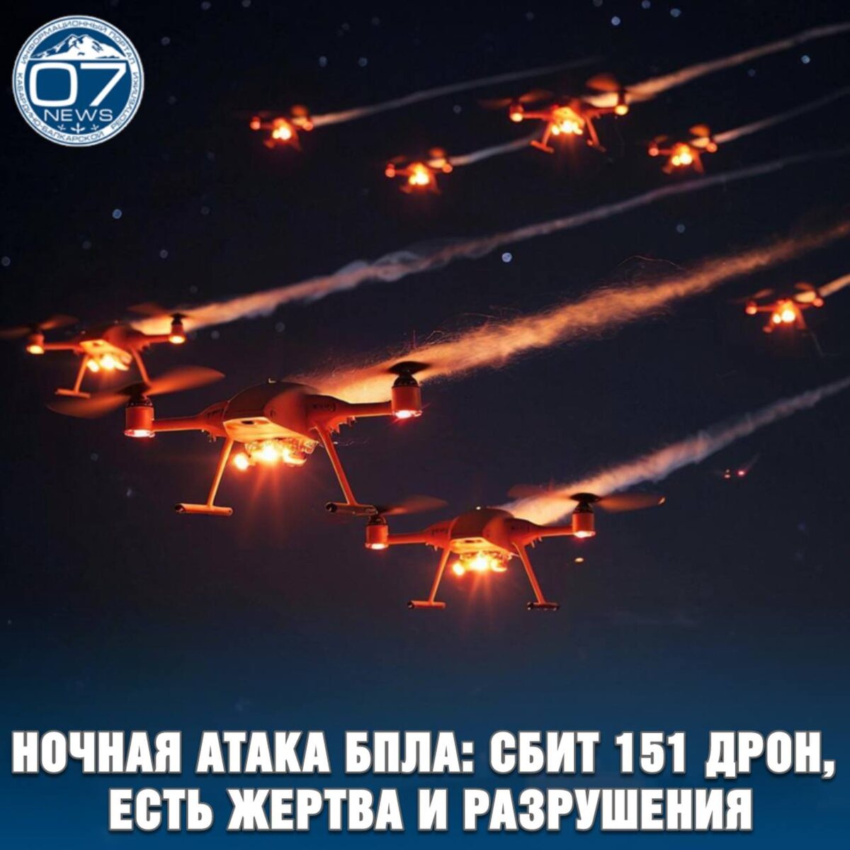 Основной удар пришёлся на юг страны. Больше всего дронов сбили над Ростовская область — 48, а также над Волгоградская область — 57. Ещё 35 аппаратов уничтожены в Белгородская область. Девять БПЛА ликвидированы над акваторией Каспийское море, по одному — в Республика Калмыкия и Тамбовская область. В Ростовской области более 50 беспилотников сбили в 10 районах. По словам врио губернатора Юрий Слюсарь, пострадавших нет. В Волгоградской области последствия оказались серьёзнее. Как сообщил губернатор Андрей Бочаров, повреждены 13 жилых домов, линия электропередачи и газопровод. В городе Волжский погиб один человек. Кроме того, в Светлоярском районе региона загорелась ёмкость с нефтепродуктами. Из-за угрозы атак нарушена работа авиации: задержаны вылеты и прилёты более 10 рейсов в аэропортах Пермь, Оренбург и Казань. Telegram: Новости КБР | Instagram: 07.news | Дзен: 07news