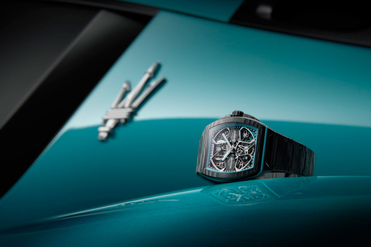 Bianchet UltraFino Maserati Flying Tourbillon Ref. TNUFFTSKMST100 — это инженерный мост между миром гоночных прототипов Maserati и часовой механикой. Здесь автомобильная ДНК модели MC Pure переводится в пропорции и конструкцию часов Bianchet, без лишних метафор: форма рождается из расчёта баланса массы, материалов и динамики. Открытая архитектура циферблата интегрирована в калибр, без наложений. Трёхлучевая структура мостов напрямую отсылает к трезубцу Maserati — это не декор, а несущий элемент. Прозрачные промежутки пропускают свет, подчёркивая объём и глубину. Переливы в оттенках AI Aqua Rainbow эхом повторяют интерьер MC Pure, связывая визуал с источником. Летающий турбийон в центре — фокус, где сложность конструкции проявляется в работе. Диаметр 40 мм, толщина 9,9 мм. Углеродное волокно высокой плотности с вставками вулканизированной резины. Вес — 36 граммов без ремешка, что минимизирует инерцию, как в автоспорте. Геометрия следует золотому сечению — фирменный приём Bianchet. Сапфи