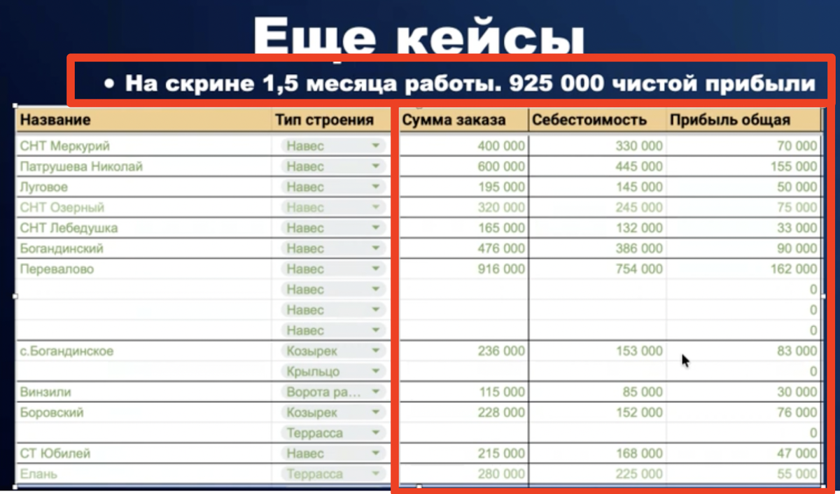 На экране таблица с результатами за полтора месяца работы. Девятьсот двадцать пять тысяч рублей чистой прибыли. Это не товарный бизнес, не закупка и перепродажа. Это услуги. Посредничество. Человек, который никогда не брал в руки штукатурку, не устанавливал заборы и не строил навесы, заработал эти деньги, просто соединяя клиентов с исполнителями.