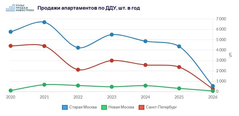 Разобрали данные по апартаментам в новостройках за 2020–2026 годы. Коротко о главном. 🔑 В 2026 году запланирован большой объём ввода На 2026 год приходится крупный ввод ранее начатых проектов: в Старой Москве — 17 768 апартаментов (против 6–7 тысяч в 2023–2025 годах), в Петербурге — 11 976 лотов против 1 694 в 2025. Это значит, что в 2026 году ключи получат многие собственники, которые давно ждали свои апартаменты 🎉 В Старой Москве после 2026 года ввод апартаментов сходит почти в ноль: на 2027 год — 2 565 лотов, на 2028 — всего 237. В Новой Москве к вводу после 2026 года ничего не планируется. В Санкт-Петербурге ввод запланирован вплоть до 2029 года: 1 010 лотов в 2027, 1 833 в 2028 и 2 272 в 2029. 📉 Апартаментов строят меньше В Старой Москве выход новых апартаментов в продажу достиг пика в 2022 году — 10 254 лота. К 2024 году объём упал до 2 396 лотов, в 2025 — всего 1 080. Это почти в 10 раз меньше пика. В Санкт-Петербурге похожая картина: пик в 2022 году (6 607 лотов), в 20