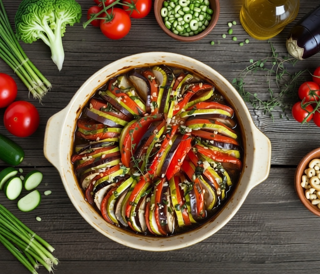 Готовность рататуя можно определить по мягкости овощей и золотистому оттенку верхнего слоя. Если овощи легко протыкаются вилкой — блюдо готово.
