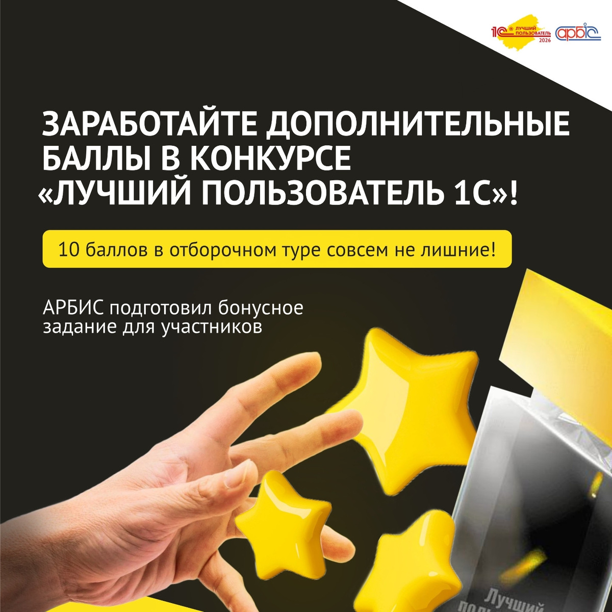 Как и в предыдущие годы, АРБИС приглашает участников конкурса «Лучший пользователь 1С» за бонусными баллами! Напоминаем, что в отборочном туре помимо баллов за прохождение теста вы можете выполнить дополнительное задание от организаторов, и получить за это бонусные баллы. Мы решили не менять задание, к которому участники конкурса уже привыкли по предыдущим годам. Расскажите о конкурсе и своём участии в нём в своих социальных сетях и получите ещё 10 баллов! Шаг 1⃣. ПОДПИШИТЕСЬ на страницу АРБИС в социальной сети ВКонтакте vk.com/arbis29 Шаг 2⃣. СДЕЛАЙТЕ РЕПОСТ любого вышедшего в 2025 году поста о конкурсе (с тегом #ЛучшийПользователь1С@arbis29) со страницы АРБИС в ВК в свой аккаунт (на свою «ВК-стену»). Вы можете пояснить, почему вы рассказываете о конкурсе, описать свою причастность к нему, например «Решила в этом году участвовать в конкурсе» или «Каждый год участвую в этом конкурсе! Записалась и в этом году! Друзья, присоединяйтесь!», или оставить любой другой позитивный комментарий п