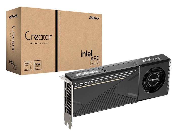 Компания ASRock, мировой лидер по производству материнских плат, видеокарт, мини-ПК, игровых мониторов и блоков питания, анонсировала новые видеокарты Intel Arc Pro B70 Creator 32 ГБ и Intel Arc Pro B70 Passive 32 ГБ, ориентированные на рабочие станции. Серия Intel Arc Pro B70 оснащена до 32 ГБ видеопамяти, специально разработанной для удовлетворения потребностей современных систем логического вывода на основе искусственного интеллекта. Благодаря новейшим механизмам искусственного интеллекта Xe Matrix Extensions (XMX) эти видеокарты обеспечивают исключительную производительность и поддерживают конфигурации с несколькими графическими процессорами в Linux для работы с большими языковыми моделями (LLM). Кроме того, они сертифицированы независимыми поставщиками программного обеспечения (Independent Software Vendor, ISV) и оснащены оптимизированными драйверами, которые значительно повышают производительность при работе с различными API, особенно с OpenGL. Видеокарта Intel Arc Pro B70 Creato