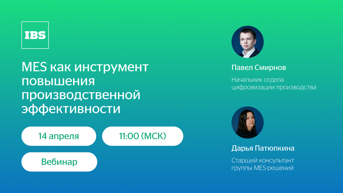 Как выявить потенциальные возможности повышения эффективности производства? Как достичь желаемых эффектов? На эти и другие вопросы ответят эксперты группы компаний IBS на вебинаре про MES-системы. Он пройдёт 14 апреля в 11:00 МСК. Вебинар бесплатный, для доступа необходимо пройти регистрацию, — рассказали MASHNEWS организаторы. Вебинар от IBS Group «MES как инструмент повышения производственной эффективности». 14 апреля, 11:00 МСК. ИЛЛЮСТРАЦИЯ: IBS Group. MES (Manufacturing Execution System) — система управления производственными процессами, которая может стать эффективным инструментом для автоматизации управленческих и контрольных функций. "14 апреля в 11:00 МСК на бесплатном вебинаре выступят специалисты группы компаний IBS: начальник отдела цифровизации производства Павел Смирнов и старший консультант группы MES-решений Дарья Патюпкина. Они представят практический опыт внедрения MES-систем, а также рассмотрят критерии успешности проектов, способы сбора данных и оценку эффективности