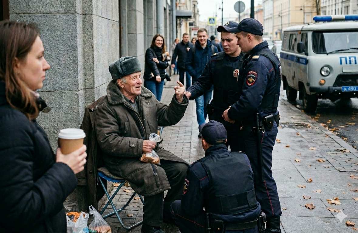 Ситуация изменилась, когда к тротуару плавно подъехала машина ППС. В ней не было ничего необычного, но сама ее остановка будто поставила точку в этой тихой, почти камерной сцене. Из машины вышли двое, затем к ним присоединился третий, и вся их троица направилась к старику с тем самым выражением лиц, которое заранее обещает неприятности. В их движениях чувствовалась не столько забота о порядке, сколько привычка действовать по инструкции, не вдаваясь в подробности.