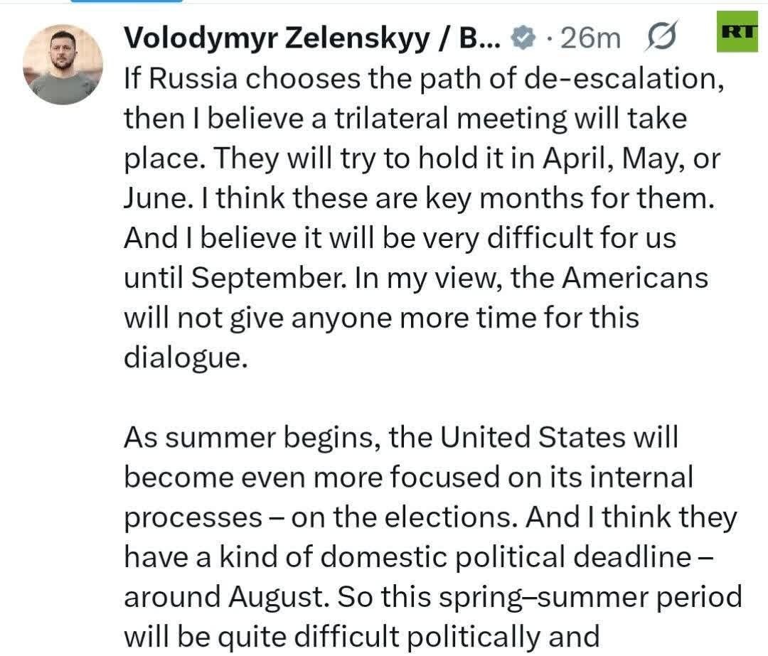 👆Zelensky says Russia will try to hold a de-escalation meeting in April, May, or June — but he can't make it because the Americans are BUSY