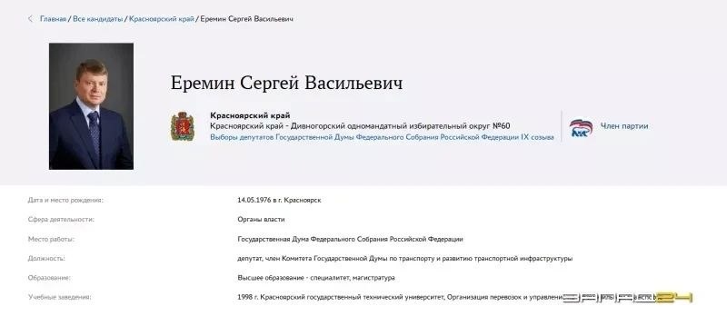 Депутат Государственной Думы Сергей Ерёмин заявился на предварительное партийное голосование «Единой России» по Дивногорскому одномандатному избирательному округу №60. Сергей Еремин в 1998 году окончил автодорожный факультет Красноярского государственного технического университета. В 2005 году окончил Красноярский государственный университет, получив еще и диплом юриста. В 2001 году защитил диссертацию на соискание учёной степени кандидата технических наук. В 2022 году защитил диссертацию на соискание учёной степени доктора технических наук. С октября 2017 по август 2022 года — глава города Красноярска. С августа 2022 по апрель 2023 года — заместитель губернатора Красноярского края. Впервые Сергей Еремин попал в Госдуму в результате довыборов после скоропостижной кончины депутата Виктора Зубарева в 2023 году. Вместе с Сергеем Ереминым на праймериз правящей партии по Дивногорскому округу №60 заявилась специалист по работе с молодежью из Минусинска, 23-летняя Алина Бревнова. Предвари