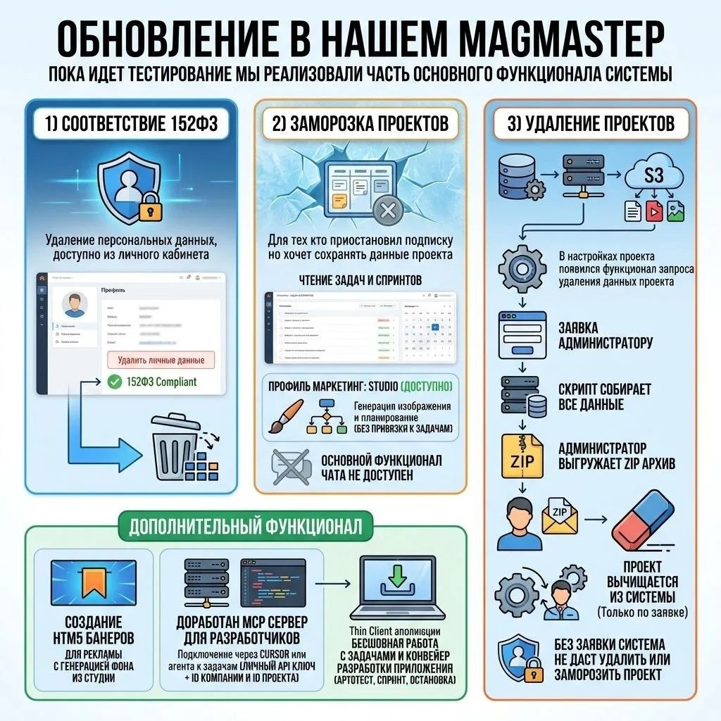 Пока идёт тестирование, мы уже реализовали часть основного функционала системы. 1️⃣. Соответствие 152‑ФЗ Удаление персональных данных теперь доступно прямо из личного кабинета. 2️⃣. Заморозка проектов Для тех, кто приостановил подписку, но хочет сохранить данные проекта. Доступно: ❤️🔥чтение задач и спринтов; ❤️🔥в профиле «Маркетинг» — студия с генерацией изображений и планированием (без привязки результата к задачам); ❤️🔥основной функционал чата не работает. 3️⃣. Удаление проектов Проект — это рабочее пространство, которое включает: ❤️🔥базу данных; ❤️🔥пространство проекта на сервере; ❤️🔥пространство в S3‑хранилище (документы, видео, изображения и т.д.). Просто так удалить проект сложно. Поэтому в настройках проекта появился механизм запроса на удаление: ❤️🔥вы оставляете заявку администратору; ❤️🔥скрипт собирает все данные с серверов; ❤️🔥 администратор упаковывает ZIP‑архив со всеми вашими данными и высылает вам; после этого проект полностью удаляется из системы. ⚠️