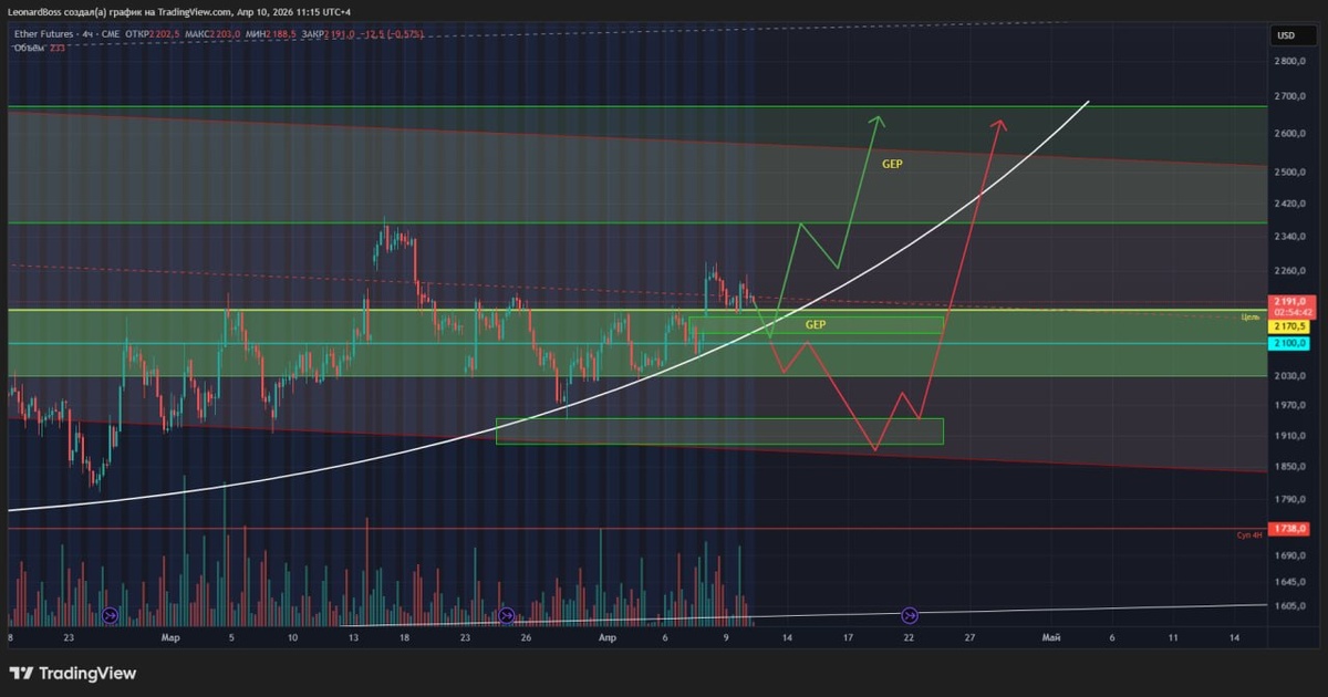 🕯 ‼️ В добавок к ранее опубликованным постам глобальной картинки по активу и его попутных, но важных графиков значений, кто пропустил быстро нейдете по хештегу #ETH, вижу 2 вероятных сценария развития событий на ближайшее время = дни - недели: 1️⃣Относительно быстрый: график 4Н ТФ по СМЕ, чтобы были видны GEPы. Прямо под ногами есть дыра, которую с большой вероятностью закроем прям сегодня, после чего очередной раз отработает уровень 2100 и в течении 1-2 недель на мощном ускорении график цена улетит закрывать верхний огромнейший по диапазону GEP, там же есть верхняя граница нисходящего канала = притяжение + сильное сопротивление = короткая коррекция + взрывной рост в сторону 4000К! Пружина достаточно сильно сжалась и не может вечно находиться в том же состоянии = законы физики работают и в экономике! 🔤 Более медленный с очередным разрывом нервов и отправкой большого числа розницы в очередной этап разочарования! Та самая среднесрочная структура на графике, которая сформирована в те
