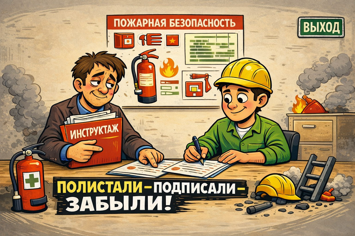 Типичная сцена, которую на таких участках видели слишком многие Представьте: утро понедельника. Новый сотрудник приходит в отдел. Его встречает коллега с папкой и усталым взглядом человека, которому лично не нужно ни от кого ничего, но система требует. — Вот, подпишите здесь. Это инструктаж по пожарной безопасности. — Подождите, а где сам инструктаж? — Да вот он, три листа. Можете полистать. — То есть я должен прочитать три листа прямо сейчас? — Нет, вы должны подписать. Прочитать — по желанию. И сотрудник подписывает. Потому что все так делают. Потому что некогда. Потому что «да что тут может случиться-то». Сцена повторяется в России примерно сто тысяч раз в день. --- Роструд знает. Каждый год при проверках больше 50% штрафов — за нарушения в сфере охраны труда. И самое частое нарушение — не сломанная лестница. Это непроведение инструктажа. Или его проведение в формате «полистали — подписали — забыли». Казалось бы: бумажка и бумажка. Кто-то подписал, значит, ознакомился. Логика железн