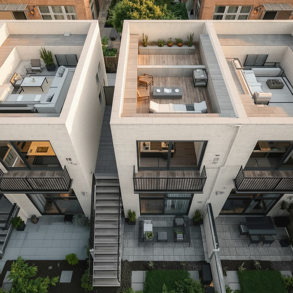 Один стационарный дверной выход на плоскую кровлю — и площадь здания (ИЖС или дом блокированной застройки) в ЕГРН вырастает. Это не метафора. Это буквально то, как работает нормативная система. Всё решает классификация кровли. Если на кровлю есть стационарный дверной выход — она автоматически признаётся эксплуатируемой. Эксплуатируемая кровля включается в площадь здания при кадастровом учёте. Это прямо следует из п. 3.14 СП 1.13130.2020 и п. 7.16 СП 4.13130.2013. Если выхода нет, или выход только через люк без стационарной двери — кровля неэксплуатируемая. В площадь не входит. Разница в ЕГРН может составить площадь всей кровли блока. Представьте блок с плоской кровлей площадью 90 м². Если в проекте предусмотрена дверь на кровлю с лестницей — эти 90 м² попадают в ЕГРН. Это увеличивает налоговую базу. Это увеличивает площадь в документах. Это может создать расхождение с ТЭП, если в ТЭП кровля не была учтена. И наоборот: если кровля планируется как эксплуатируемая терраса — продаётся как
