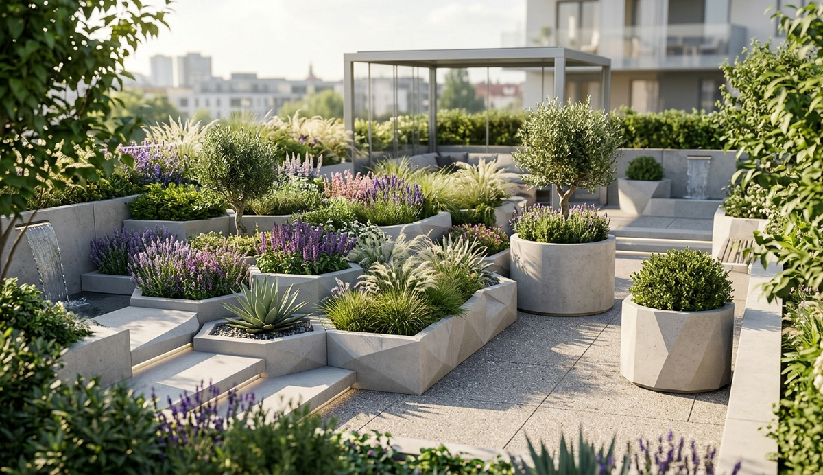 Применение архитектурного бетона в ландшафтном дизайне 2026 года: кашпо и многоярусные клумбы