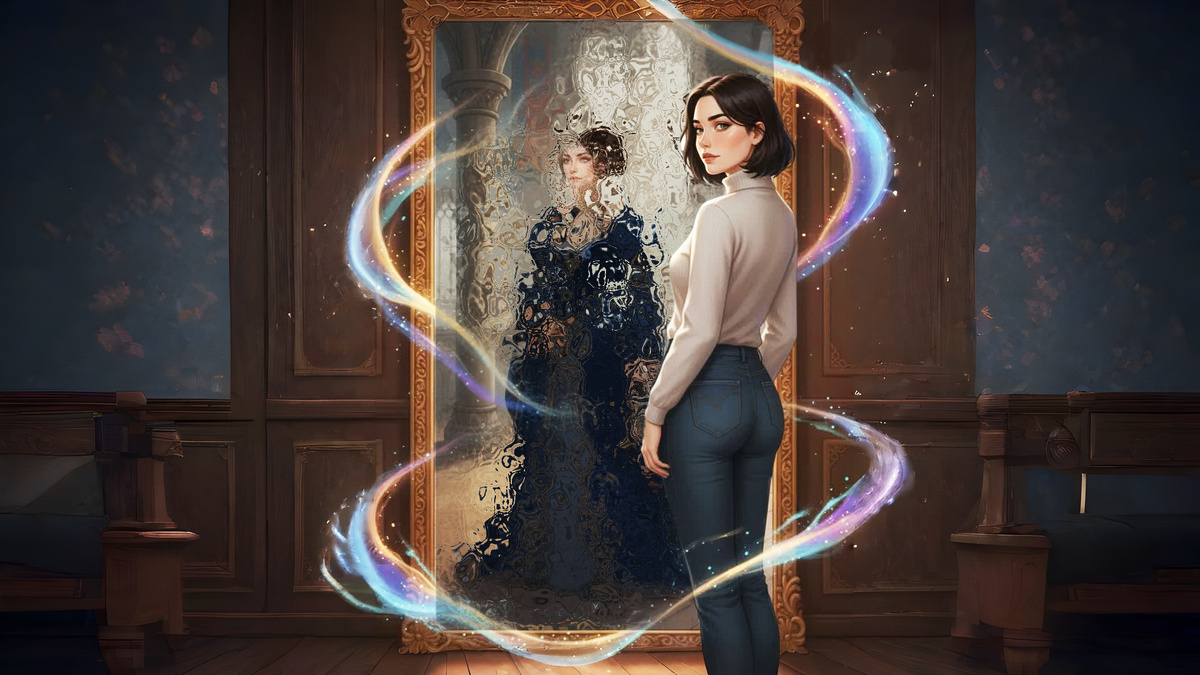 Она снова перевернулась и вдруг почувствовала, что на неё смотрят. Это было странное ощущение — не звук, не движение, а что-то между. Как будто чей-то взгляд коснулся затылка. Юля открыла глаза и повернула голову. Напротив кровати, у стены, стояло старое зеркало в тяжёлой резной раме. Огромное, почти в полстены, с потускневшим стеклом, в котором отражалась комната — кровать, балдахин, прикроватная тумбочка. И она сама — маленькая фигурка в белой рубашке.