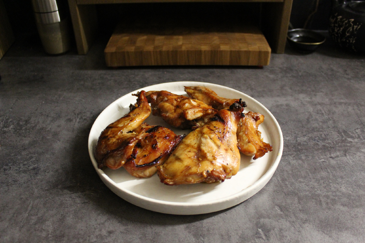 📋 Кролик - 1 шт. Соевый соус - 3 ст. л. Чеснок - 3 зубчика Имбирь - 10 гр. Перец молотый - 0,5 ч. л. Кунжутное масло - 1 ст.л. Первым делом делаем маринад. Для этого чеснок и имбирь чистим, измельчаем и смешиваем в ёмкости с соевым соусом и кунжутным маслом. Разделываем кролика на части. Заливаем кролика маринадом и отправляем в холодильник минимум на час. Обжариваем кролика до образования золотистого цвета. Первым делом на гриль выкладываю ноги и плечи, затем, через 10 минут выкладываю грудку. Первый раз ноги и плечи переворачиваю минут через 8-9, грудку минут через 4-5 и перевернув, убираю их с прямого жара, периодически переворачивая. Доготавливаю их на непрямом жару ноги и плечи минут 15-20, а грудку минут 10. Во время жарки на гриле можно периодически смазывать мясо оставшимся маринадом. Использую угольный гриль с крышкой. Приятного аппетита!