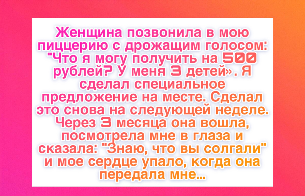 “Я управляю небольшой пиццерией и в основном работаю по ночам. Однажды позвонила женщина с дрожащим голосом: «Вы можете доставить заказ в приют для бездомных? У меня трое детей… у меня есть только 500 рублей». Этой суммы не хватило бы и на одну пиццу, но я ответил: «У нас семейное спецпредложение: четыре пиццы, хлебные палочки и напитки за 500 рублей». Она расплакалась. Я приготовил заказ, добавил печенье и сок и лично доставил его. Через три месяца она устроилась на работу, сняла квартиру и принесла в пиццерию 16 000 рублей со словами: «Пожалуйста, позвольте мне передать добро дальше». Эти деньги положили начало программе помощи. За пять лет мы доставили 830 бесплатных обедов. Сегодня она работает социальным работником, а ее дети помогают упаковывать коробки для приютов. Недавно ее дочь сама приготовила пиццу для нуждающейся семьи и сказала: «Мама говорит, вы спасли нас. Теперь я тоже могу спасти кого-то».”