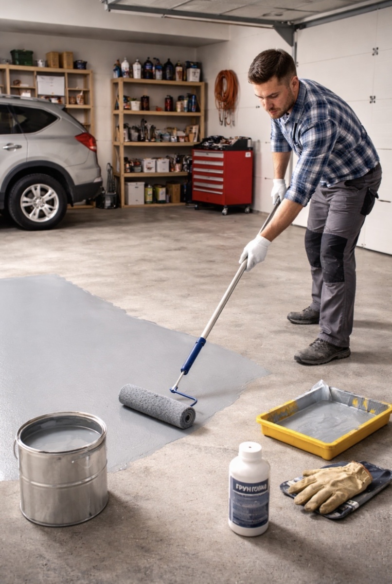 Бетонный пол в гараже постоянно подвергается серьёзной нагрузке. На него воздействуют вес автомобиля, влага, перепады температуры, химические жидкости и абразивная пыль. Со временем бетон начинает крошиться, пылить и терять прочность. Именно поэтому покраска бетонного пола — не просто декоративное решение, а важный этап защиты поверхности. Правильно подобранная краска по бетону и грамотная подготовка основания позволяют значительно продлить срок службы пола и сделать его более устойчивым к износу. Первый этап работы — подготовка поверхности. Бетон должен быть прочным, сухим и очищенным от грязи, пыли и масляных пятен. Если на полу есть старое покрытие, его необходимо удалить. Трещины и сколы желательно заделать ремонтными составами. Чем лучше подготовлена поверхность, тем дольше будет служить новое покрытие. После очистки пола рекомендуется выполнить шлифовку или хотя бы тщательно удалить цементную пыль. Бетон имеет пористую структуру, и пыль на поверхности может ухудшить сцепление кра