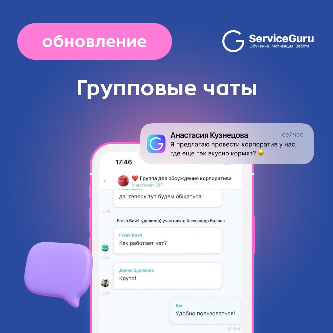 Мы уже разобрали контроль стандартов и организацию событий, но важна и среда, в которой живет коллектив. 🆕 Встречайте долгожданное обновление в ServiceGuru — 💬 Групповые чаты! Теперь на платформе доступны: 🟢Создание групп: объединяйте сотрудников по отделам, сменам или конкретным проектам (например, «Кухня», «Официанты», «Открытие новой точки»). 🟢 Управление участниками: администратор может легко добавлять или удалять коллег, сохраняя конфиденциальность рабочих процессов. 🟢Мгновенные уведомления: команда оперативно получает Push-сообщения о новых обсуждениях. 🟢Единое инфополе: все рабочие вопросы решаются там же, где сотрудники проходят обучение и смотрят новости, что повышает фокус команды. ❗️Перенос коммуникации на платформу делает ваш бизнес независимым от работы внешних сервисов и возможных сбоев в привычных мессенджерах. Ваше инфополе — под полным контролем и всегда доступно. 🚀 Попробуйте групповые чаты в деле! Чтобы узнать, как подключить и настроить новый модуль для ва