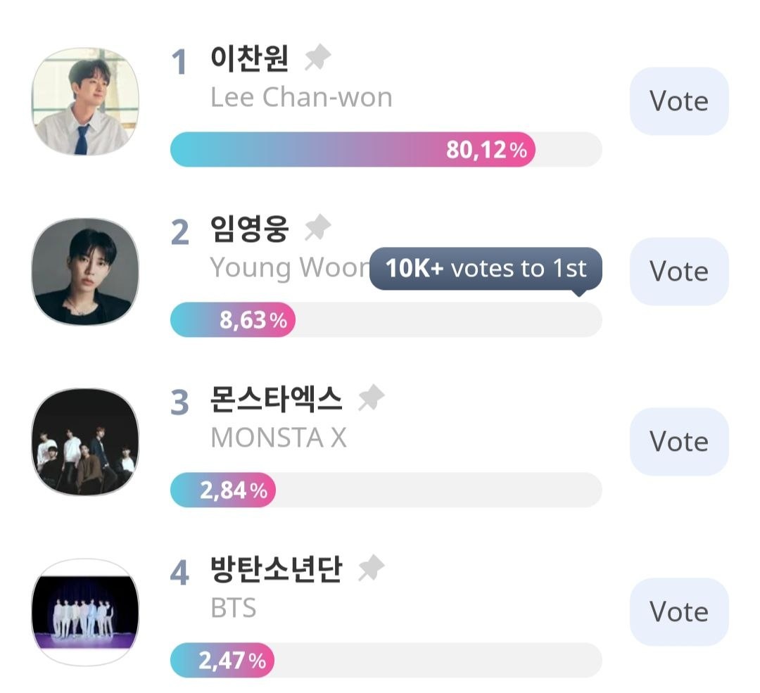 : • Korea Wave Award • Popularity Award • K-pop World Choice Group Все категории полностью зависят от голосов, победители определяются по сумме всех голосов за все раунды, поэтому каждый голос имеет значение. Голосовать можно каждый день. Этапы голосования: • Раунд 2: 10 апреля – 30 апреля; • Финал: 8 мая – 28 мая. Голосование проходит через приложение Idolchamp: 1. Скачиваете приложение и регистрируетесь. 2. Находите раздел голосования, выбираете Seoul Music Awards и нужную категорию: • Korea Wave Award • Popularity Award • K-pop World Choice Group 3. Голосуете за BTS. В приложении есть бесплатные задания (просмотр рекламы/ежедневный вход/различные миссии), за которые можно получить валюту для дополнительного голосования. #BTS @kumihobts