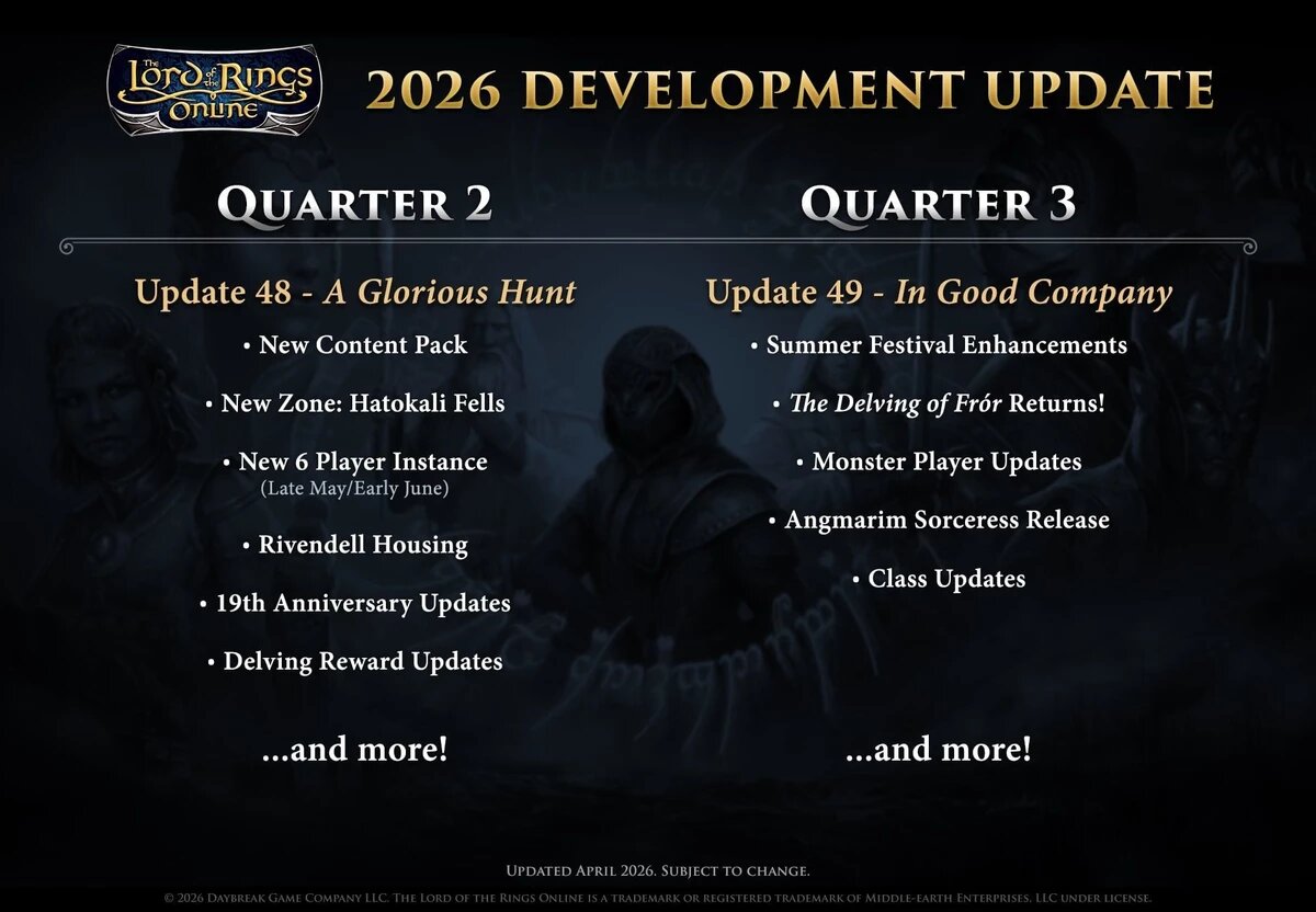 Разработчики The Lord of the Rings Online опубликовали масштабные планы на 2026 год. Второй квартал ознаменуется выходом обновления 48 «Славная охота», которое завершит сюжетную линию Хамат Рехьюд. Игроков ждут элитное жилье в Ривенделле и контент-пак Hatokali Fells с 75 заданиями. Также команда продолжает внедрять поддержку 4K-интерфейса и готовится к 19-летию проекта. В третьем квартале выйдет апдейт 49 «В доброй компании», включающий обновление Эттенских высот и, вероятно, новый класс — Ангмарскую колдунью. Главным событием конца года станет крупное расширение, подробности которого раскроют в июне. Студия Standing Stone Games обещает насыщенное лето с новыми наградами и фестивалями. https://youtu.be/KLKVrJP3gYA
