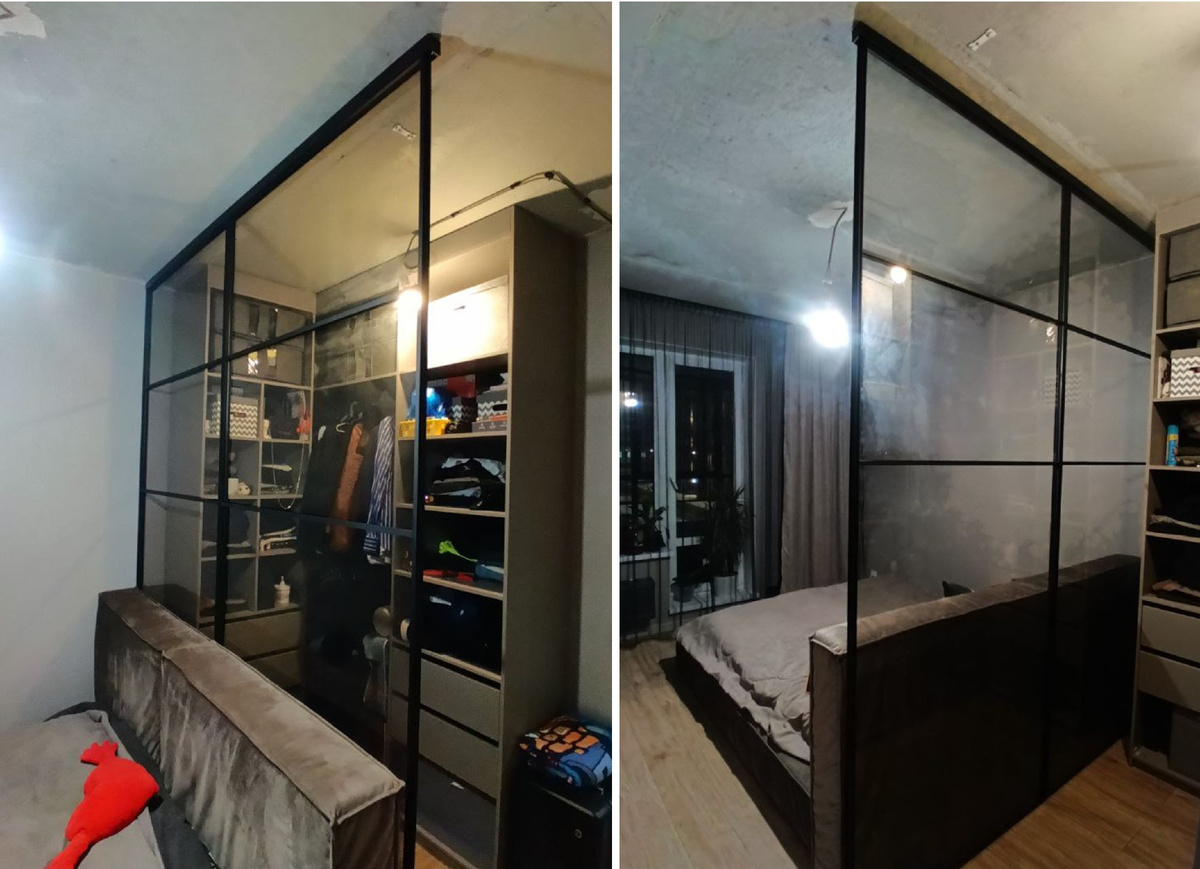 Чёрный профиль KO01 — чёткий, уверенный, без компромиссов. Он задаёт интерьеру ритм, подчёркивает линии и делает даже простую гардеробную архитектурно выразительной. Стекло Стопсол графит — это не просто тонировка, а специальное пиролитическое покрытие. Снаружи стекло выглядит зеркально, изнутри — мягким, уютным серым, без эффекта аквариума. + В гардеробной на солнечной стороне — защитит вещи от выцветания