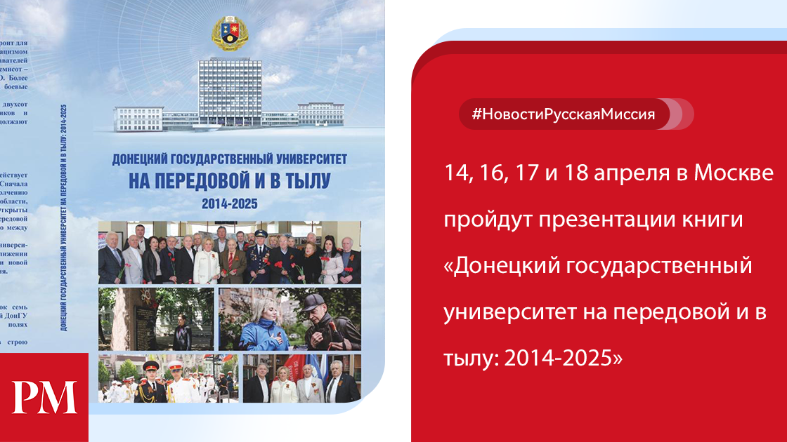 В презентациях книги примут участие помощник ректора Донецкого государственного университета (https://t.me/DonNU_DNR) Наталия Москаленко, профессор МГУ имени М.В.Ломоносова Дмитрий Андреев, выпускники Донецкого государственного университета, герои книги Владимир Сухинин, Михаил Третьяков и Валерий Демидов, директор БФ «Русская миссия» Щипкова и соучредитель БФ «Русская миссия», доцент Финансового университета при Правительстве РФ Даниил Щипков. ⏬ Презентации пройдут с 14 по 18 апреля: 📌14 апреля - в Финансовом университете при правительстве Российской Федерации; 📌16 апреля - в Российском православном университете святого Иоанна Богослова 📌17 апреля – на факультете журналистики Московского государственного университета имени М.В.Ломоносова; 📌18 апреля – в Центральном Доме журналиста. ➡️ Книга «Донецкий государственный университет на передовой и в тылу: 2014-2025» создана в рамках проекта «Сохраним память о героях СВО», реализуемого БФ «Русская миссия» при поддержке Фонда Президентск