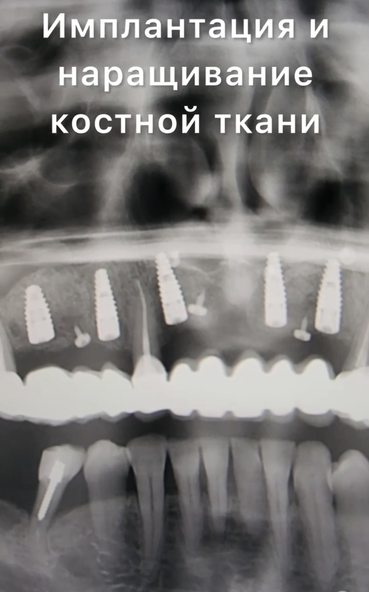 Представляем вашему вниманию сложный клинический случай, который наглядно демонстрирует возможности современной имплантологии и костной пластики. Пациент обратился в клинику с частичным отсутствием зубов на верхней челюсти — сохранилось лишь несколько зубов, а в зоне отсутствующих зубов наблюдался выраженный дефицит костной ткани как по толщине, так и по высоте, особенно в проекции гайморовых пазух. Для восстановления улыбки и функции жевания была проведена масштабная работа: установлено 6 имплантатов и выполнена комплексная реконструкция костной ткани. В области гайморовых пазух проведен синус-лифтинг (наращивание кости по высоте), а во фронтальном отделе — наращивание костной ткани по ширине. Эти процедуры создали необходимый объем кости для надёжной фиксации имплантатов и долговечности конструкции. Поскольку оказывать какое-либо давление на зону операции нельзя до полного приживления костного материала и имплантатов, было принято решение изготовить не съёмный протез, а временный мос