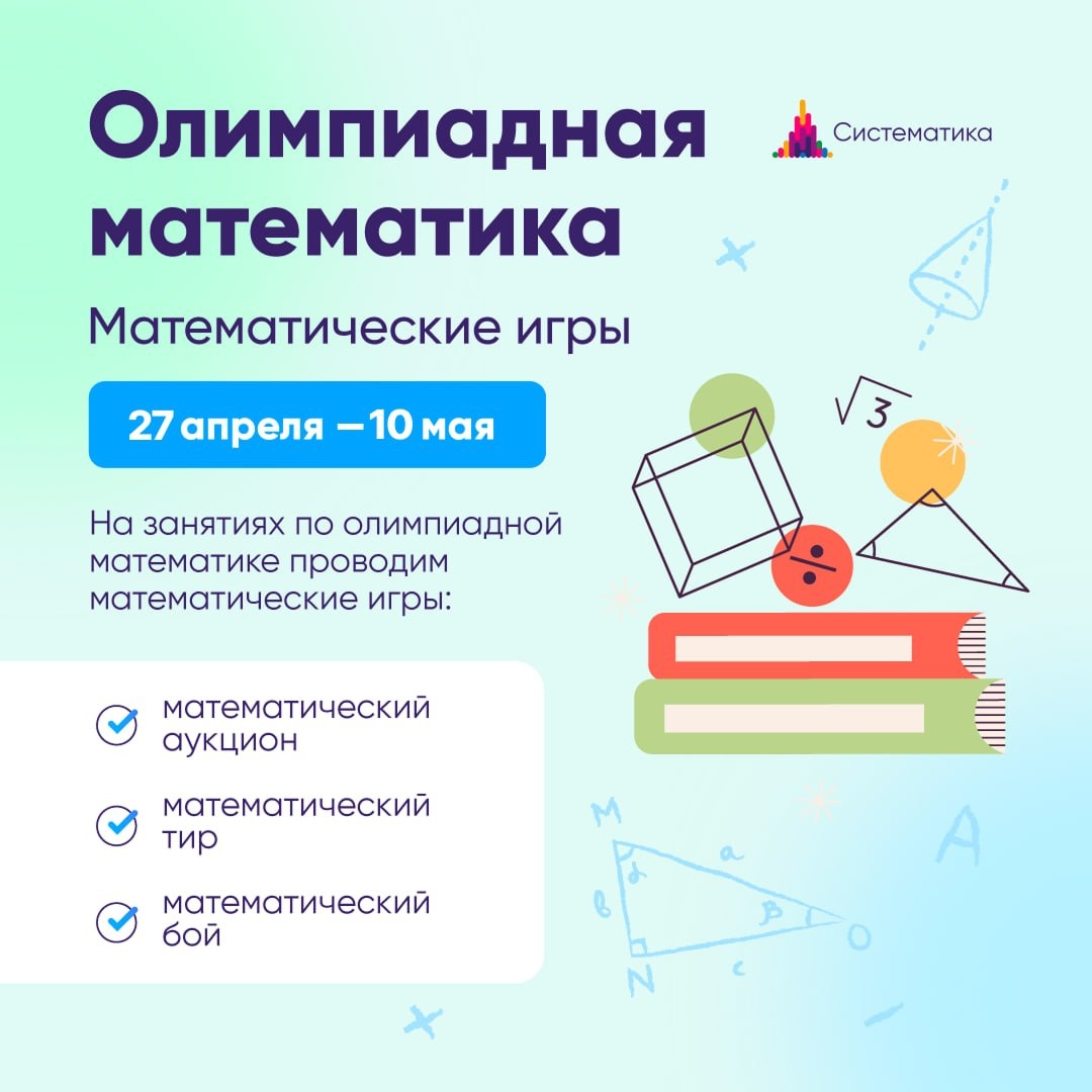 🕹 На майских праздниках в группах кружка олимпиадной математики будем по традиции играть в математические игры — это важная часть образовательного процесса Систематики. ⏺️Матигры — один из главных этапов закрепления знаний: когда ученики учатся объяснять решение другим, они присваивают знания себе и обретают уверенность ⏺️Дети пробуют свои силы в командной игре ⏺️Учатся презентовать свою точку зрения, понятно и подробно объяснять решение ⏺️ А ещё это весело, увлекательно и очень азартно! С 27 апреля во всех группах кружка по олимпиадной математике мы будем играть в математические игры! Есть 3 формата игр: ✏️математический аукцион — это соревнование команд, в каждой есть капитан. В начале аукциона каждая команда получает кредит. Игра состоит из нескольких лотов. В каждом лоте ведущим аукциона выставляется на торги одна задача. Кто дал правильный ответ, тот забирает «деньги». ✏️математический тир — ребятам предлагаются разные виды логических задач. Если отвечают правильно, зараба