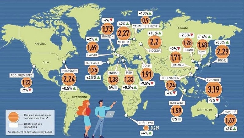 1. Кейптаун — 0,239 млн/кв.м. 2. Санкт-Петербург — 0,9 млн/кв.м. 3. Лос-Анджелес — 1,23 млн/кв.м. 4. Шэнчьжэнь — 1,24 млн/кв.м. 5. Лиссабон — 1,25 млн/кв.м. 6. Пекин — 1,28 млн/кв.м. 7. Рим — 1,33 млн/кв.м. 8. Милан — 1,38 млн/кв.м. 9. Сеул — 1,48 млн/кв.м. 10. Сингапур — 1,59 млн/кв.м На инфографике можно увидеть, как менялись цены в 2025 году. Самая дорогая премиальная недвижимость продается в Гонконге, Токио, Женеве, Нью-Йорке и Москве. URBAN B MAX