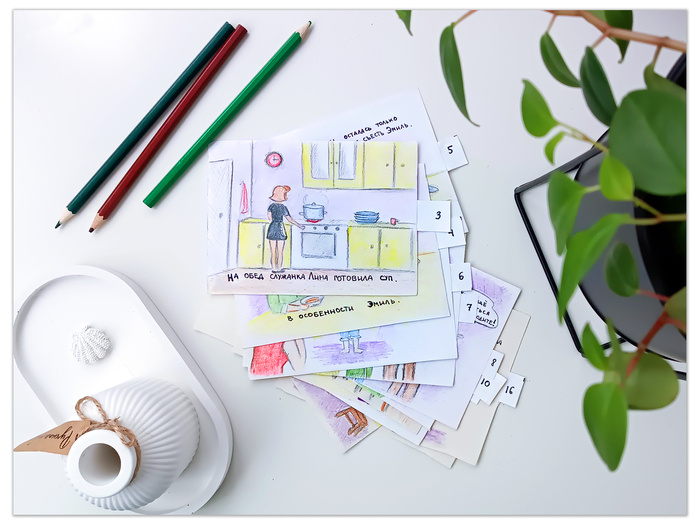 Когда мне было 8, у бабушки случился инсульт. С тех пор она, в основном, жила с нами. Передвигалась с трудом, много читала и смотрела телек, и мне казалось, что живётся ей скучно. Я развлекала бабушку как могла — писала ей письма, устраивала "поиски клада" по квартире. Рисовала комиксы, когда это ещё не было мейнстримом:) "Как Эмиль угодил головой в супницу" я нарисовала в 14 лет. Он демонстрировался в маленькой коробке без одной стороны и подсвечивался сзади фонариком наподобие слайдов. Иллюстрации взяла "из головы". Спасибо, что прочитали и, надеюсь, улыбнулись. 14-летняя я никак не могла подумать, что через 22 года её комикс увидят не только близкие, а ещё много незнакомых людей, а главное, не при помощи коробки и фонарика, как было задумано, а на своих компактных персональных компьютерах. Пост автора Darya23. Читать комментарии на Пикабу.