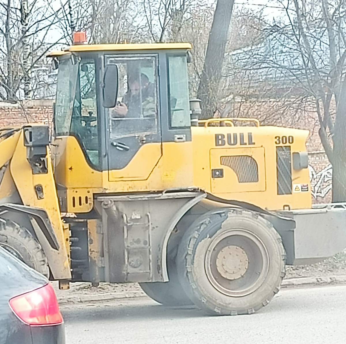 Не первый раз наблюдаю, как работает трактор в городе. Он медленно едет с приподнятым ковшом, останавливается и ждёт.