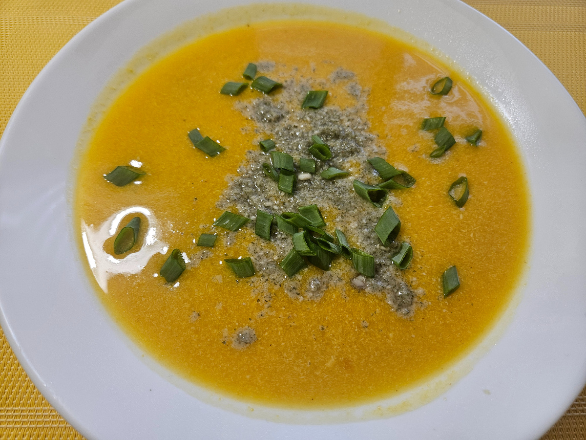 ТЫКВЕННЫЙ СУП на мясном бульоне Очень быстро и легко сварила тыквенный суп-пюре. Я всегда варю супы на мясном бульоне. Я купила -300гр филе грудки индейки (не бедро!) Я варю суп в 5 литровой кастрюле. 1. Сварила бульон, кусочки индейки оставила в кастрюле 2. Обжарила на подсолнечном+ добавила немного сливочного масла морковку, лук, чеснок, в конце куркуму и карри. 3. Кинула вариться тыкву и картошку (15-20мин) 4. Добавила пережарку (еще 3 мин поварить) 5. сливки налить за 1 мин до выключения. 6. Пробить погружным блендером. 7. Сверху посыпала измельченными тыквенными семечками + зеленым луком. Очень вкусно!Но для меня главнее-полезно.